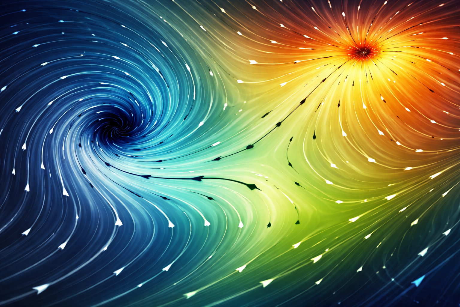 Below, mathematical symbols drift through a simplified vector flow. They are not labels — they act as tracers, revealing how abstract quantities are carried by structure.