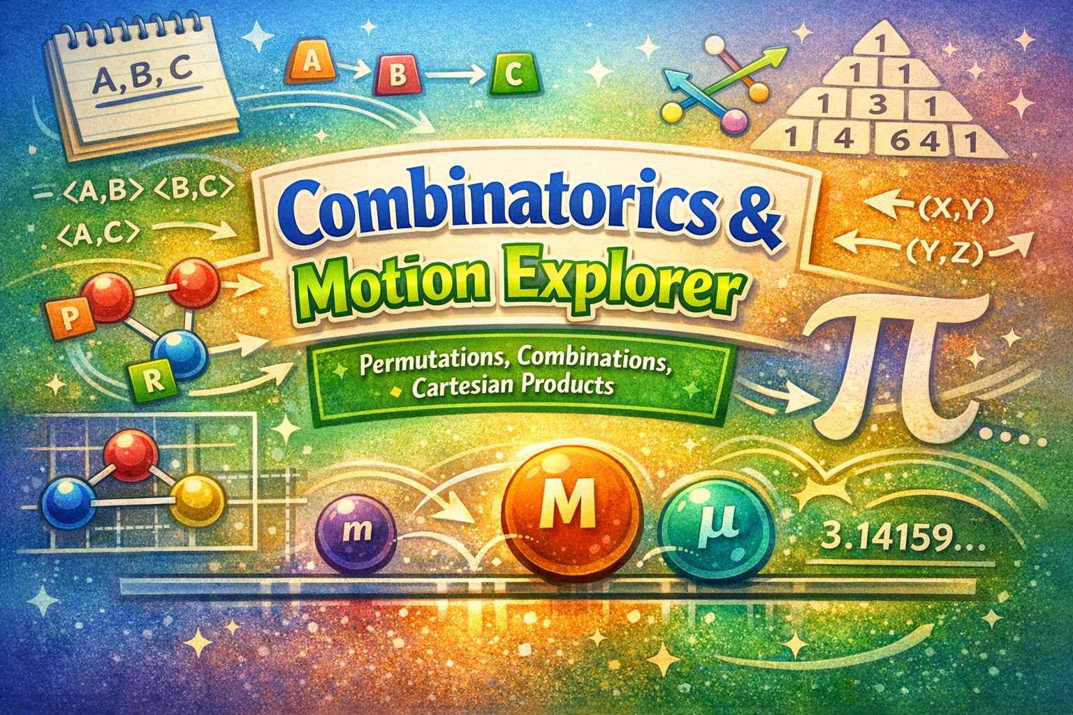 Three spheres — three masses. Their elastic collisions accumulate digits of π, emerging from the logic of motion itself.