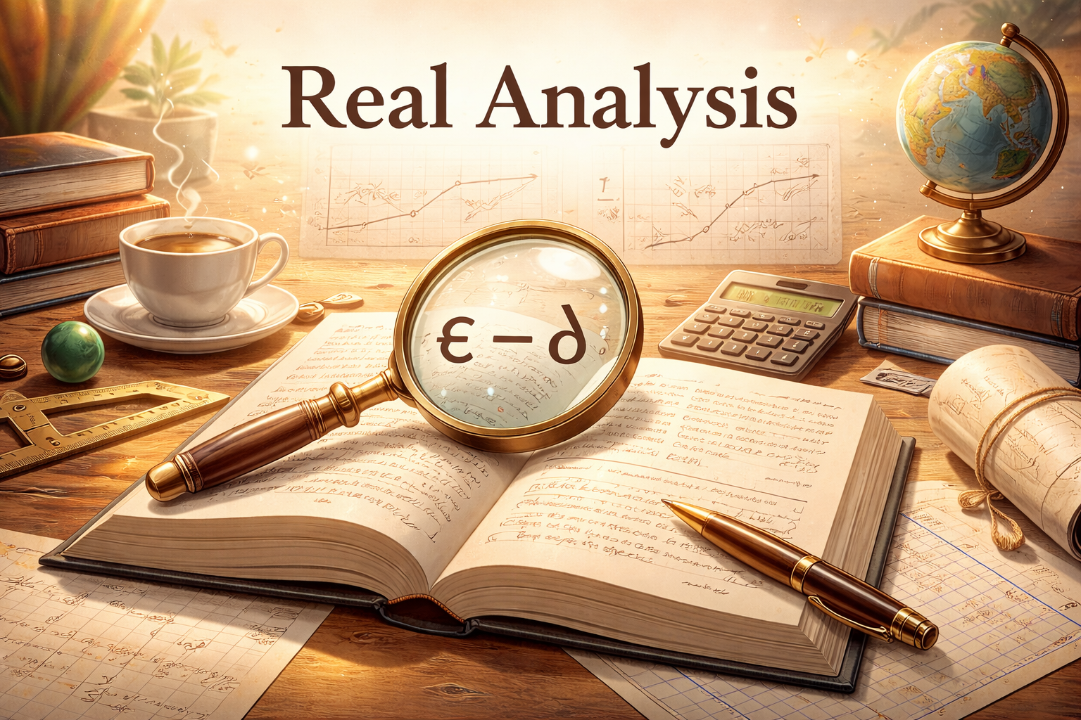Real analysis studies real numbers, real-valued functions, limits, continuity, sequences/series, convergence, and foundational theorems that underpin calculus and beyond.